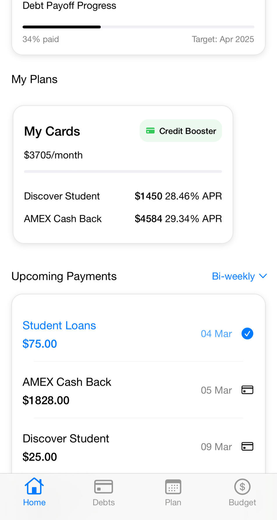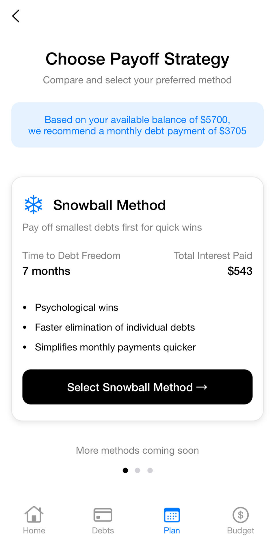 Choose a strategy that fits your financial goals. Whether it's the Snowball Method or other approaches, PayAway recommends personalized payment amounts based on your budget. Get a clear timeline to debt freedom, along with the total interest you'll save along the way.