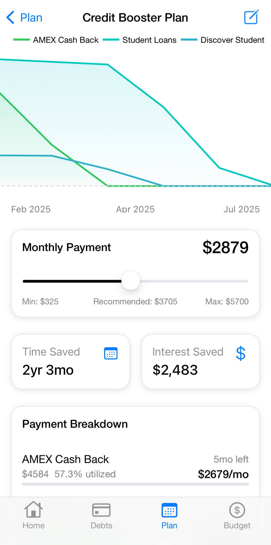 See your debt-free journey mapped out with interactive charts and payment breakdowns. Track how each payment contributes to your progress, view your projected payoff date, and watch your balances decrease over time. Knowing exactly where you're headed keeps you motivated and on track.