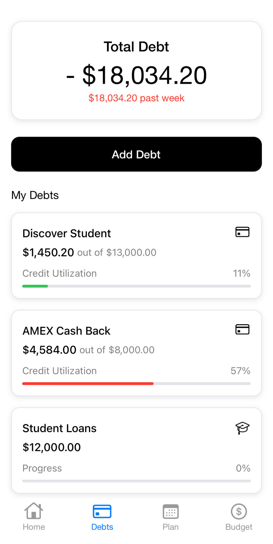 Add all your debts in one place - from student loans to credit cards. Get a clear view of your total debt, interest rates, and payment progress. PayAway helps you stay organized and motivated by showing exactly where you stand on your debt-free journey.